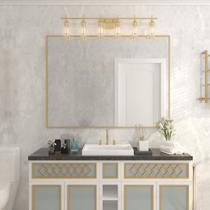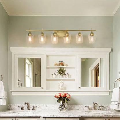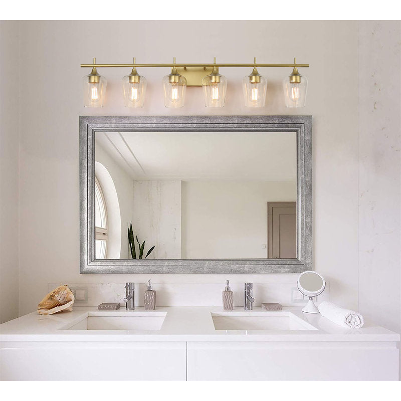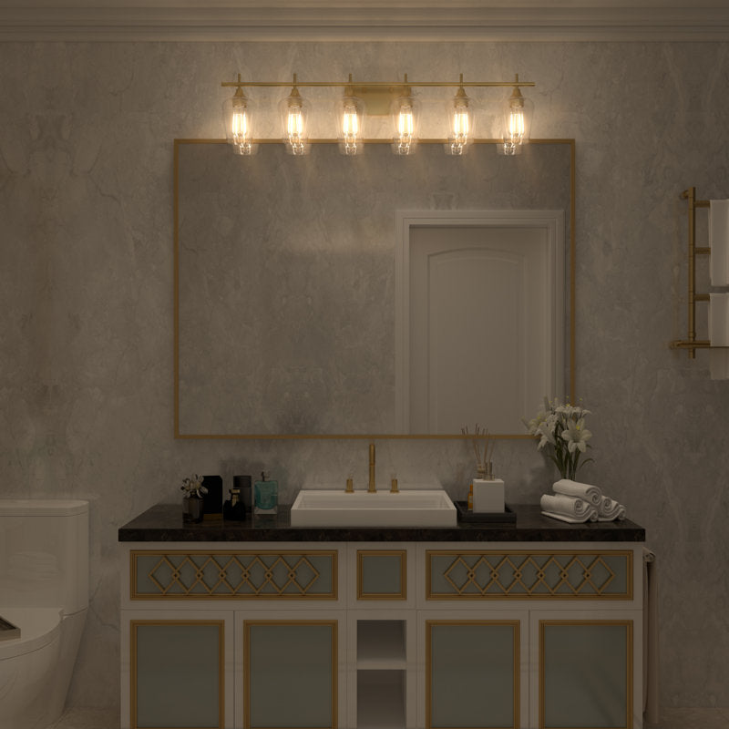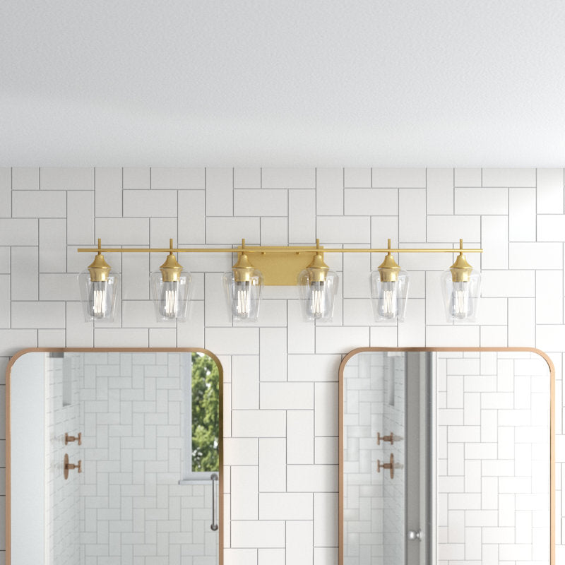Why not brighten up your bathroom vanity in a clean-lined modern farmhouse style with this vanity light? It features tapered glass bell shades with open bottoms and a hand-blown look, which hang from a steel arm and backplate. We love that this vanity light holds up to dampness in your bathroom. It takes six 60W bulbs (sold separately), and it's dimmable, so you can adjust the lighting level to suit your sleepy eyes in the mornings. Plus, you can install this hardwired light facing up or down so that it's just right for your space.