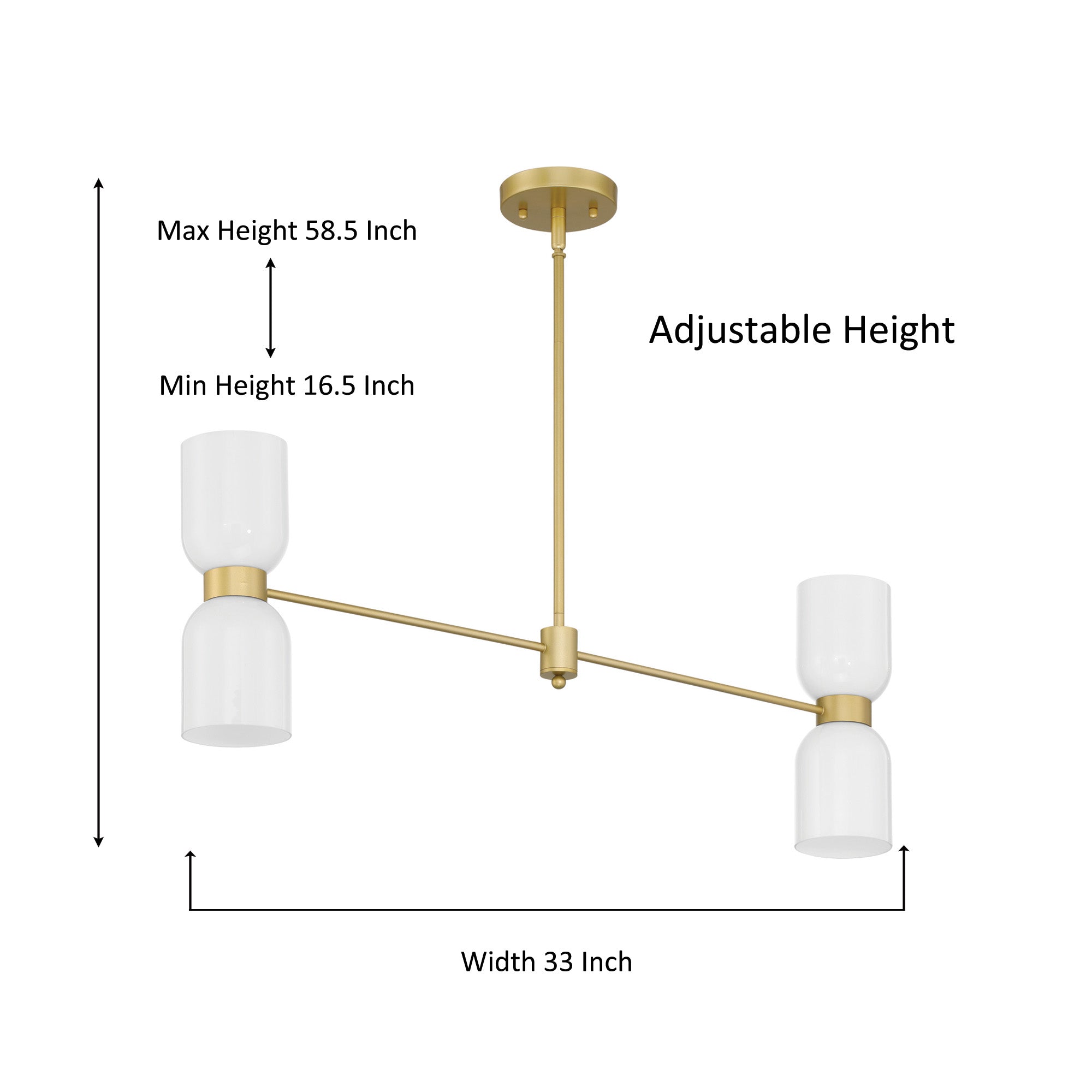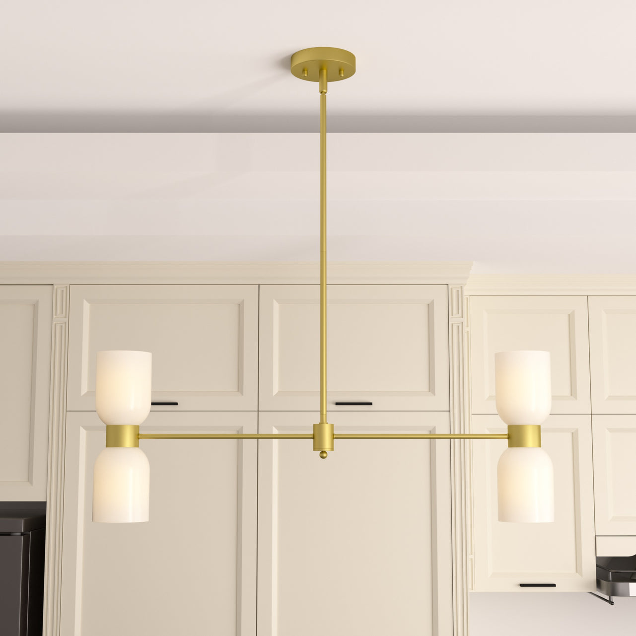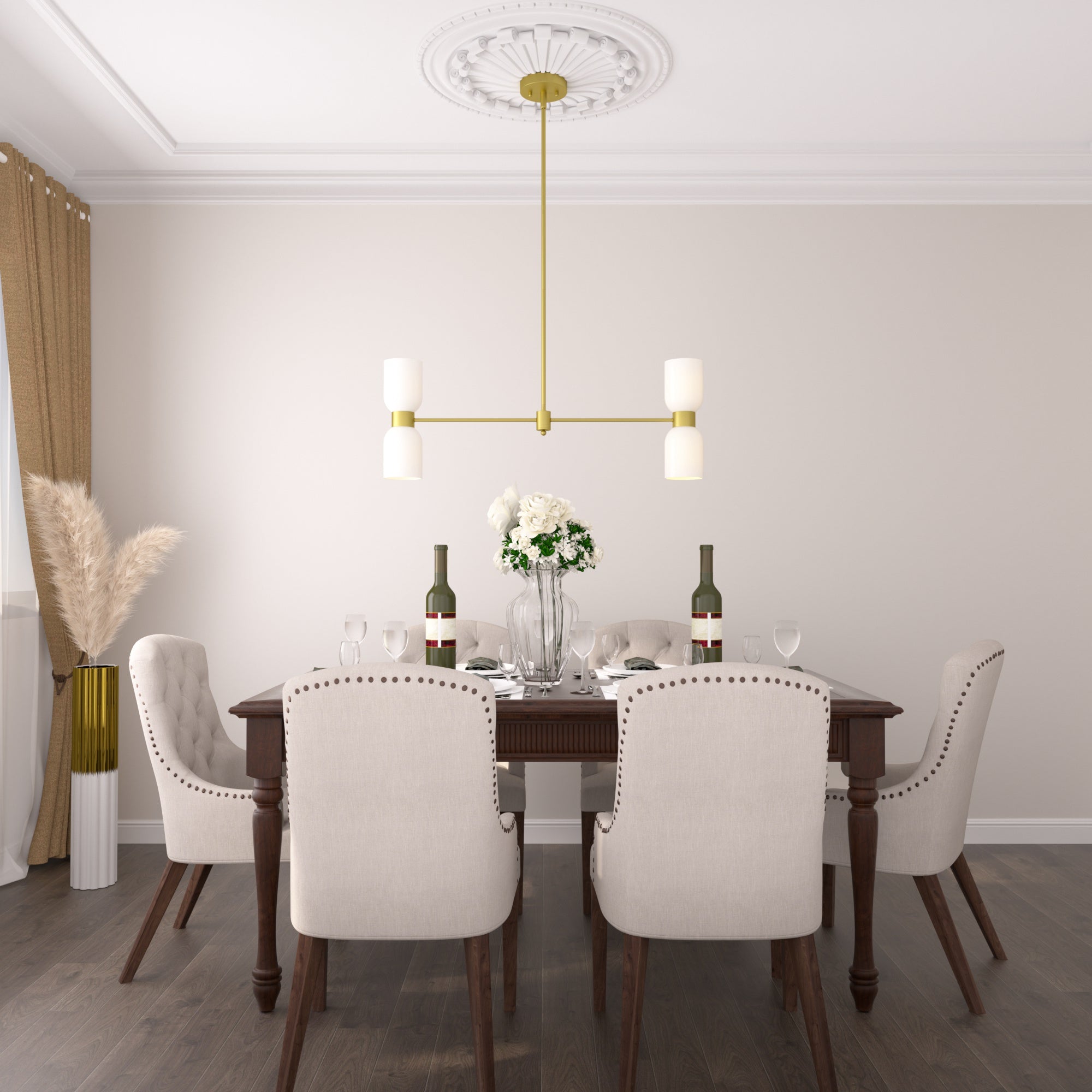 This 4-light chandelier has a thick cream white glass lamp shade, simple and elegant. With support rods made of gold quality steel, the whole is elegant. The support rod attached to the light bulb can rotates horizontally, giving you maximum space to decorate your home.When the light is turned on is romantic and warm. Suitable for living room, bedroom, dining table, hallway, etc..Best of all, this chandelier is compatible with sloped ceilings and dimmer switches, and even boasts an adjustable height for maximum versatility.