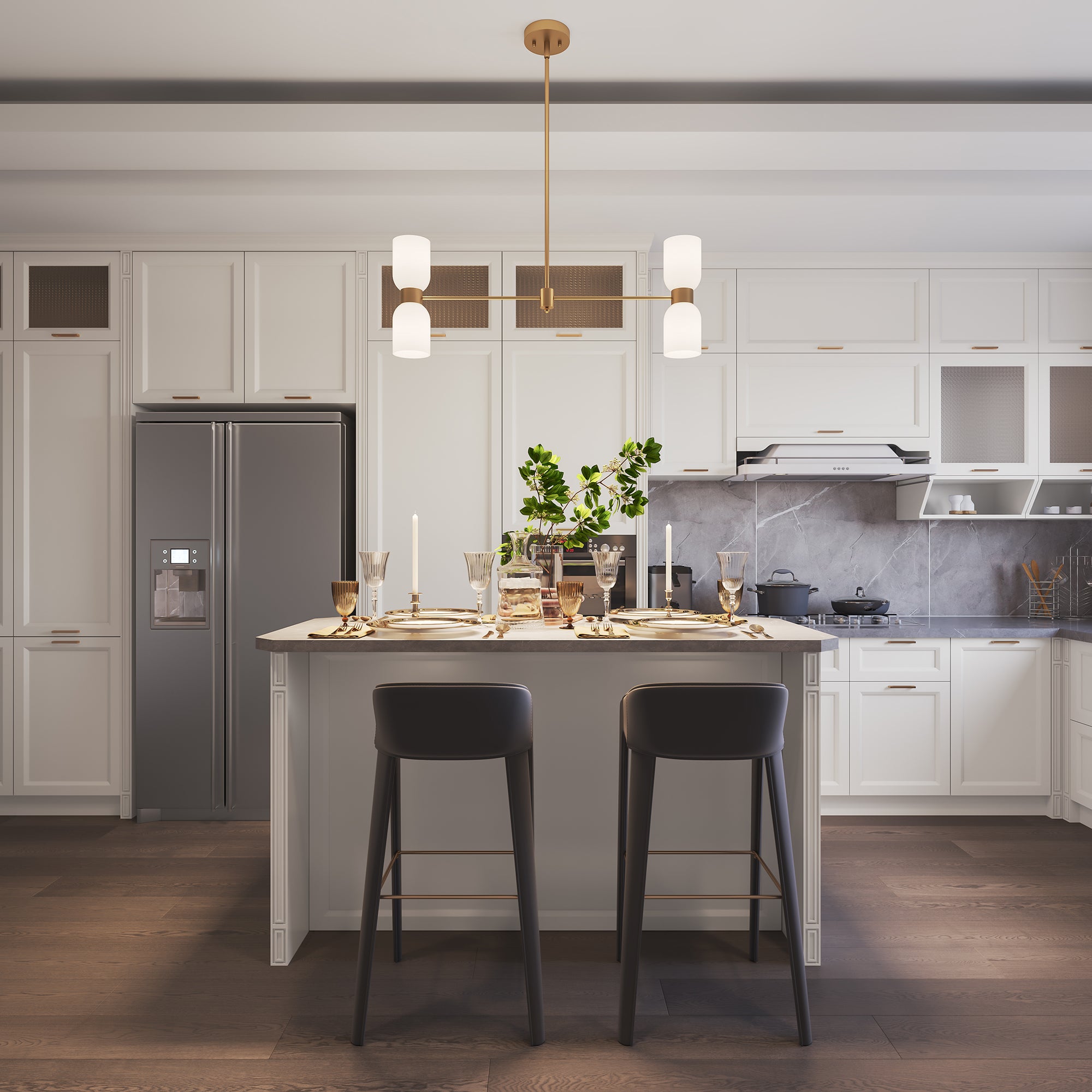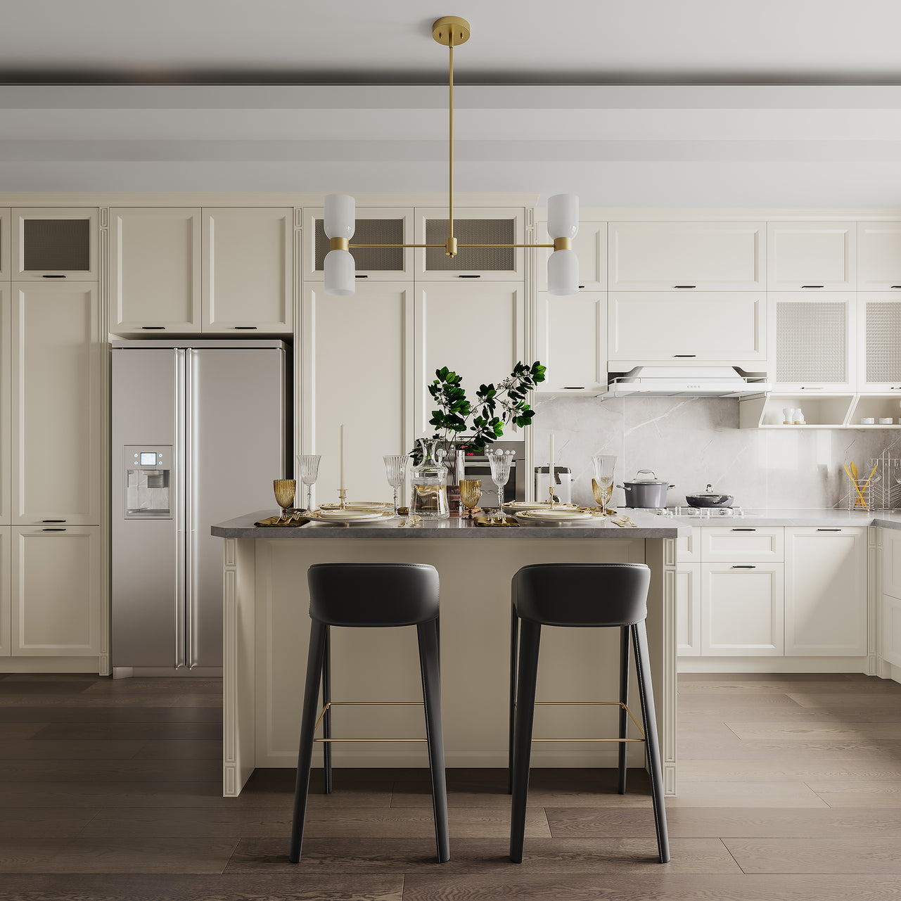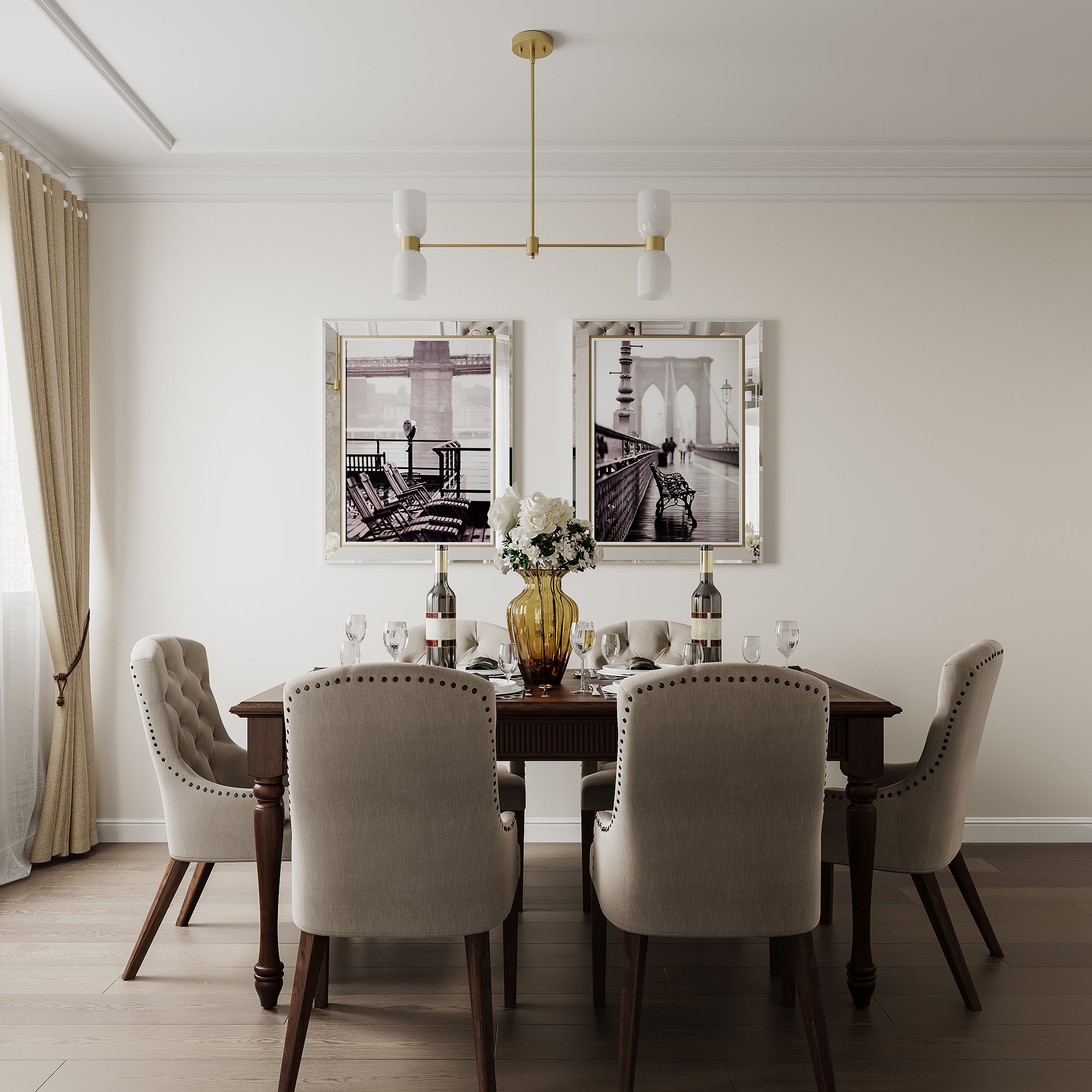 This 4-light chandelier has a thick cream white glass lamp shade, simple and elegant. With support rods made of gold quality steel, the whole is elegant. The support rod attached to the light bulb can rotates horizontally, giving you maximum space to decorate your home.When the light is turned on is romantic and warm. Suitable for living room, bedroom, dining table, hallway, etc..Best of all, this chandelier is compatible with sloped ceilings and dimmer switches, and even boasts an adjustable height for maximum versatility.